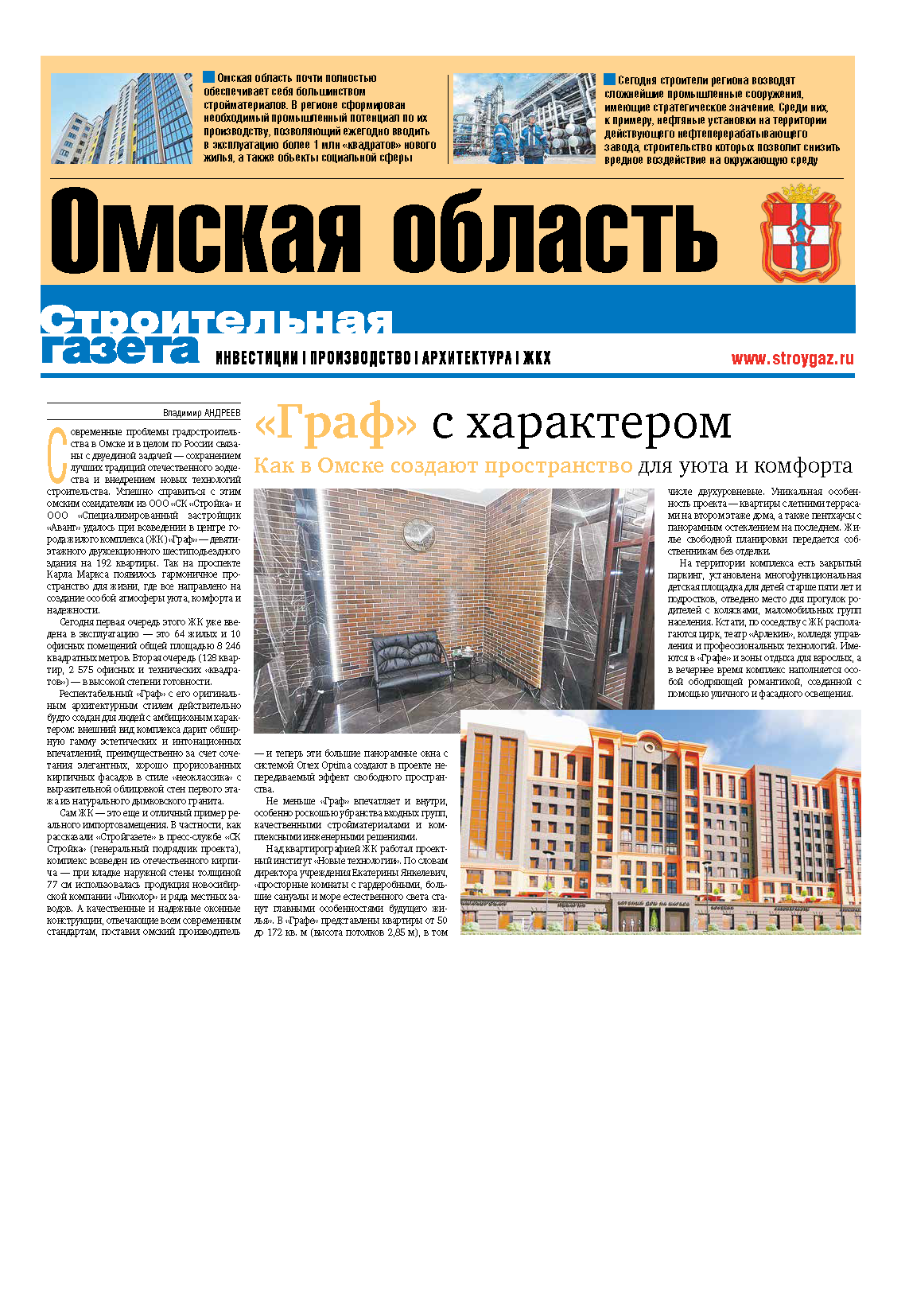 Современные проблемы градостроительства в Омске и в целом по России связаны с двуединой задачей — сохранением лучших традиций отечественного зодчества и внедрением новых технологий строительства. Успешно справиться с этим омским созидателям из ООО «СК «Стройка» и ООО «Специализированный застройщик «Авант» удалось при возведении в центре города жилого комплекса (ЖК) «Граф» — девятиэтажного двухсекционного шестиподъездного здания на 192 квартиры. Так на проспекте Карла Маркса появилось гармоничное пространство для жизни, где все направлено на создание особой атмосферы уюта, комфорта и надежности.