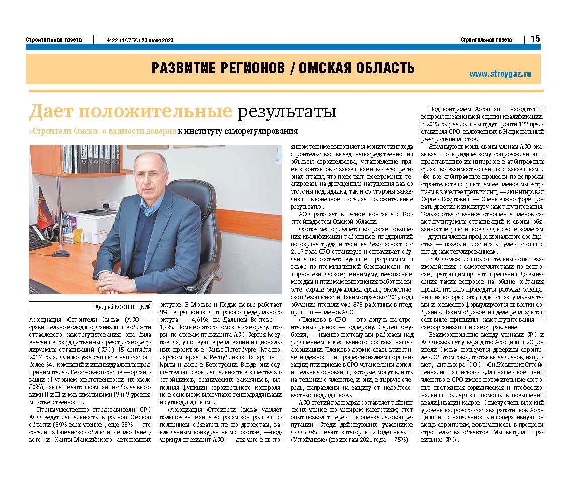 «Ассоциация «Строители Омска» уделяет большое внимание вопросам контроля за исполнением обязательств по договорам, заключенным конкурентным способом, -—подчеркнул президент АСО, — для чего в постоянном режиме выполняется мониторинг хода строительства: выезд непосредственно на объекты строительства, установление прямых контактов с заказчиками во всех регионах страны, что позволяет своевременно реагировать на допущенные нарушения как со стороны подрядчика, так и со стороны заказчика, и в конечном итоге дает положительные результаты».