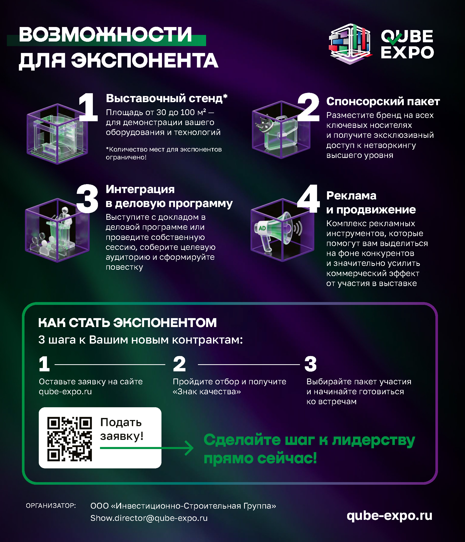 1. Оператор QUBE Expo – представитель ООО «Инвестиционно-строительная группа» Комиссаров Александр Сергеевич, тел. +7 (929) 997-63-37.
