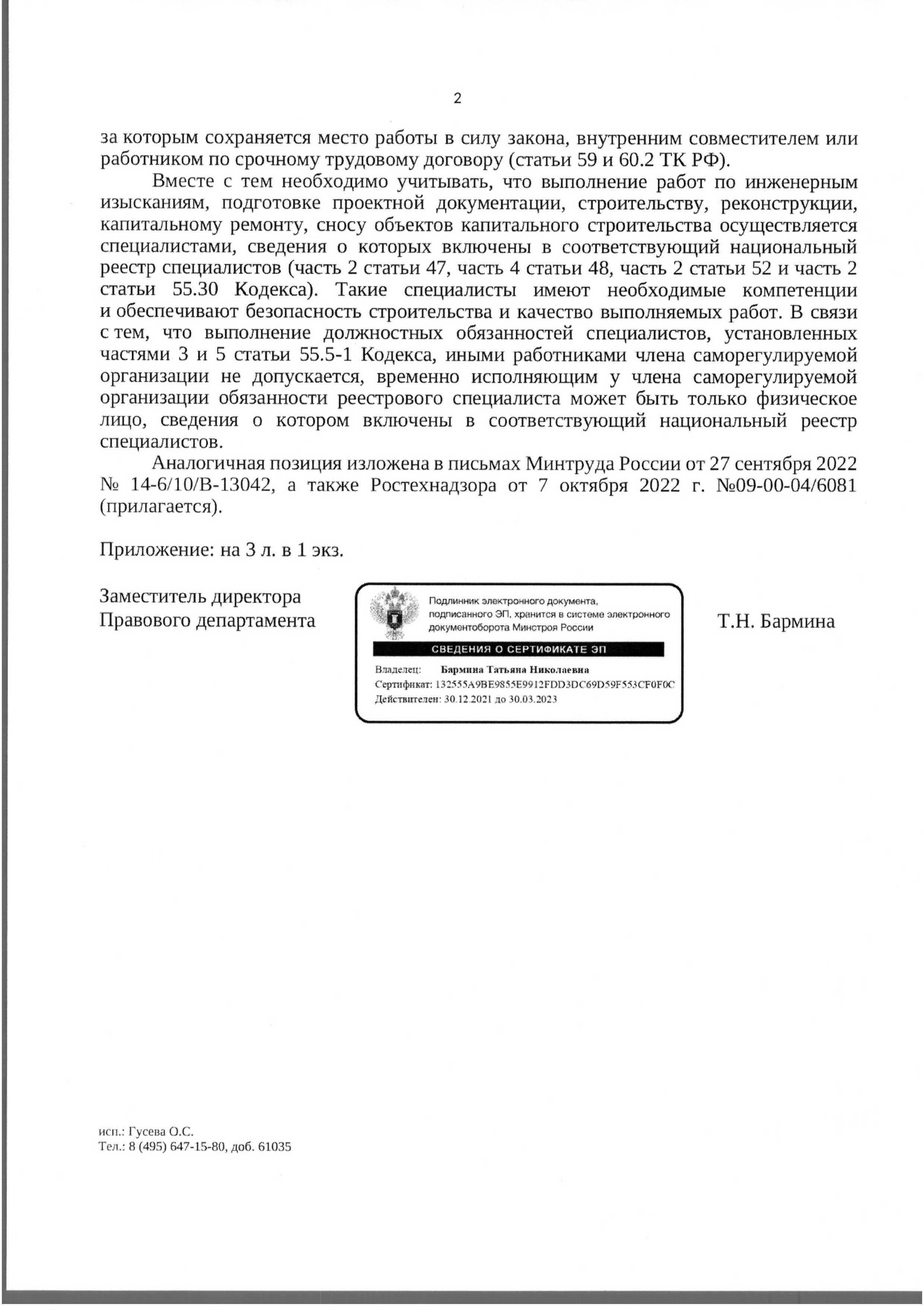 Ассоциация "Строители Омска" информирует Вас о подготовленных правовым департаментом Министерства строительства  жилищно-коммунального хозяйства Российской Федерации разъяснениях № 53441-ТБ/02 от 14.10.2022, по вопросам связанным с трудовыми договорами призванных по мобилизации специалистам, информация о которых внесена в НРС.