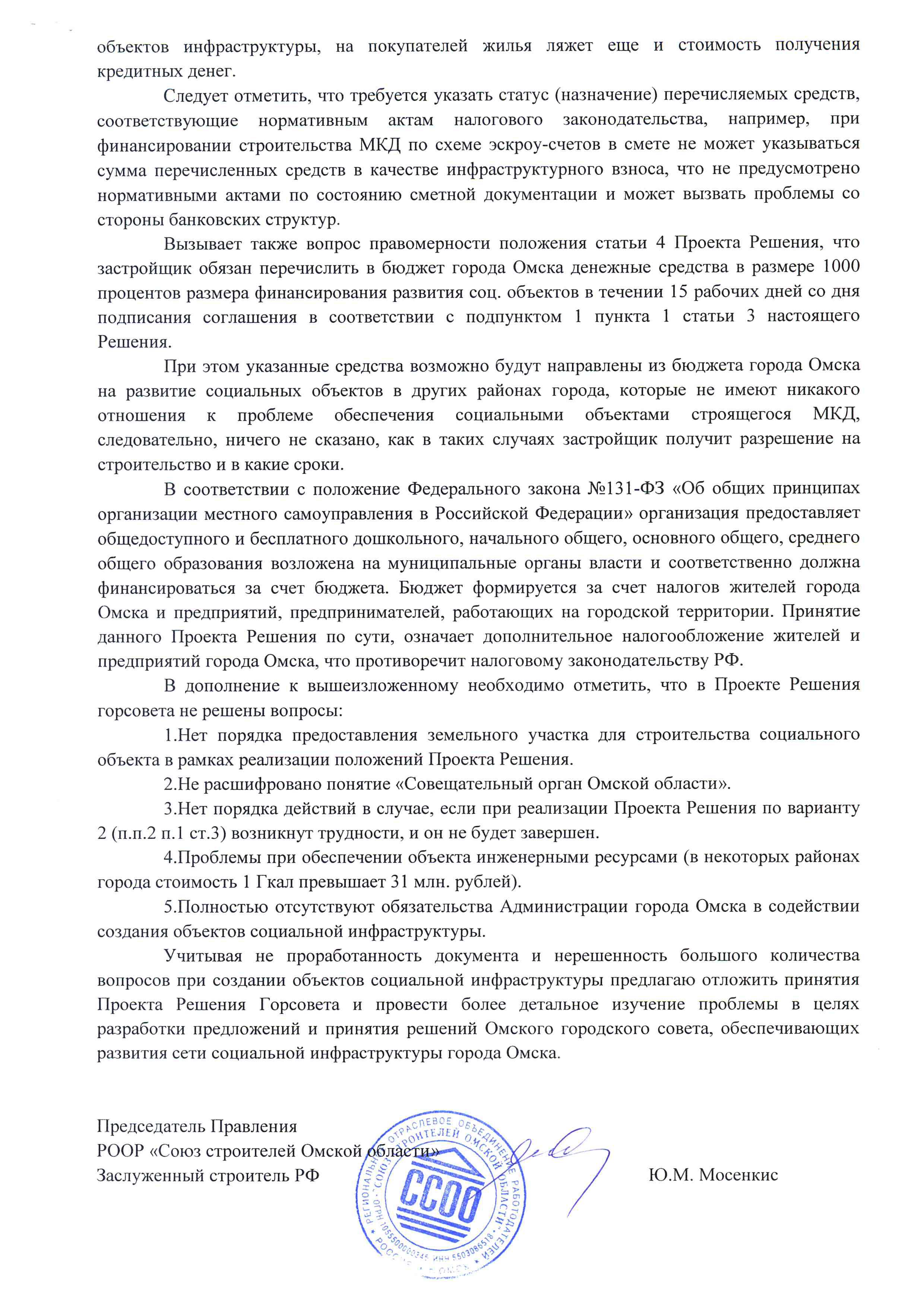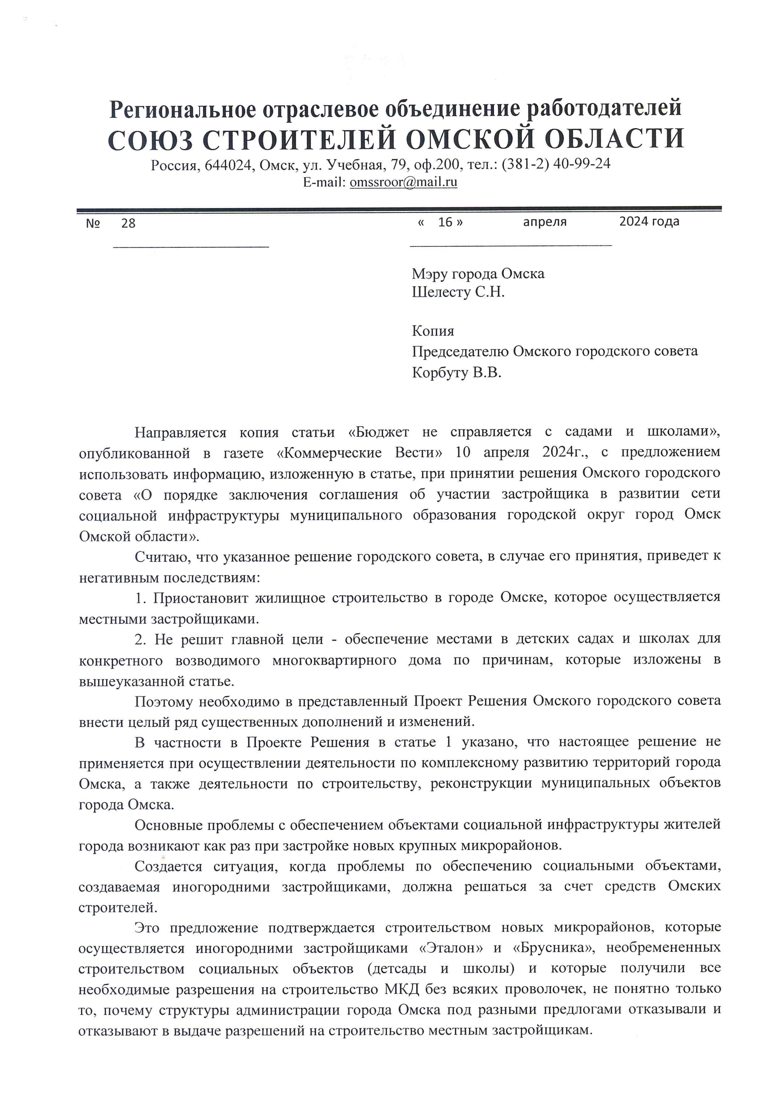 Письмо РООР "ССОО" Мэру города Омска