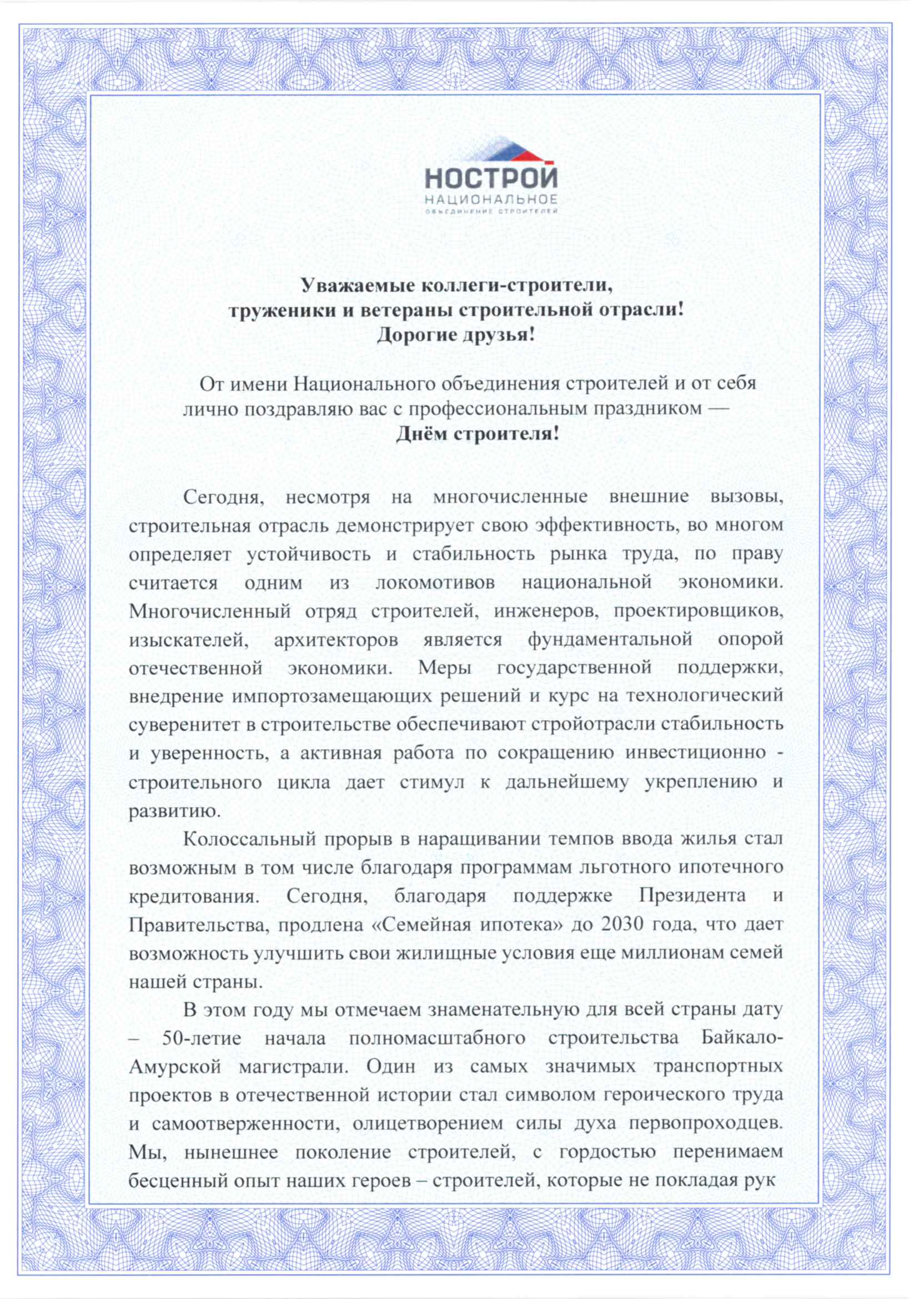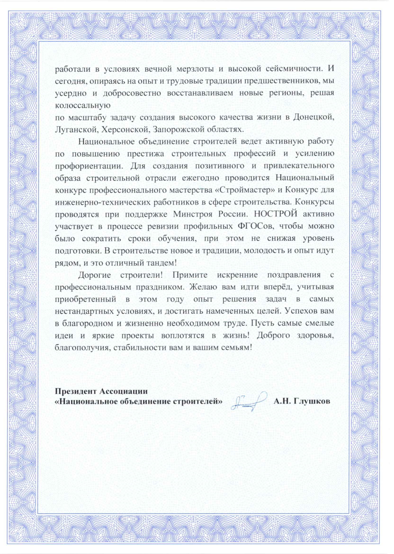 Поздравление Глушкова А.Н. с Днем строителя