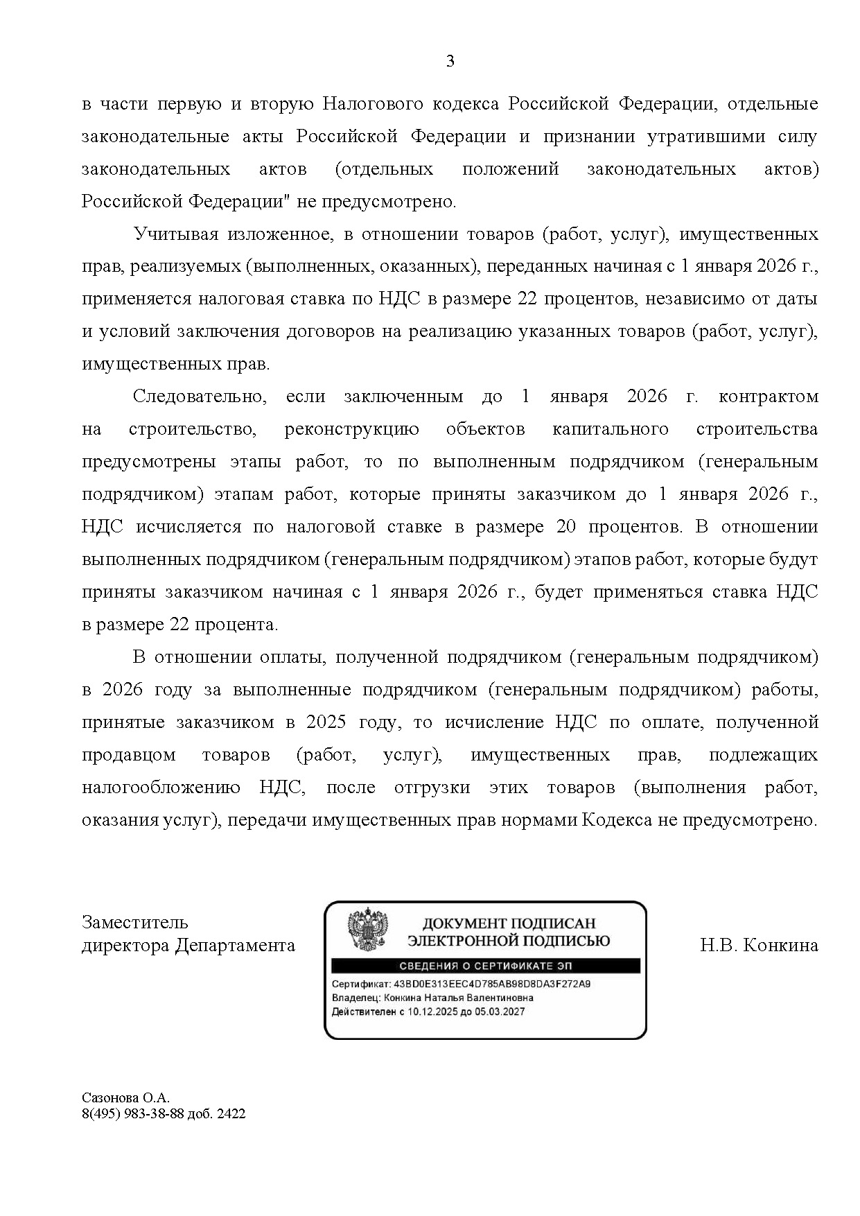 В отношении выполненных этапов работ, которые приняты с 1 января 2026 года, применяется ставка 22%.