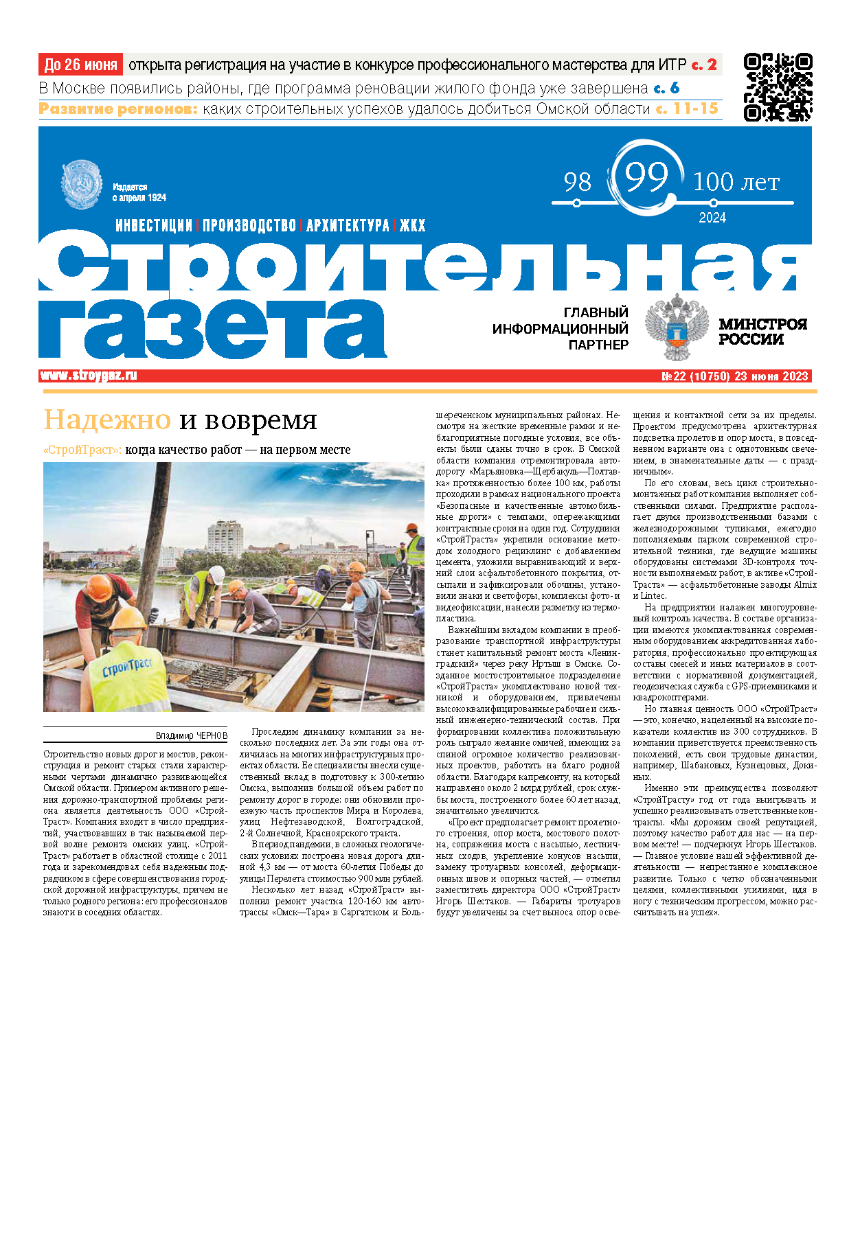 Важнейшим вкладом компании в преобразование транспортной инфраструктуры станет капитальный ремонт моста «Ленинградский» через реку Иртыш в Омске. Созданное мостостроительное подразделение «СтройТраста» укомплектовано новой техникой и оборудованием, привлечены высококвалифицированные рабочие и сильный инженерно-технический состав. При формировании коллектива положительную роль сыграло желание омичей, имеющих за спиной огромное количество реализованных проектов, работать на благо родной области. Благодаря капремонту, на который направлено около 2 млрд рублей, срок службы моста, построенного более 60 лет назад, значительно увеличится.