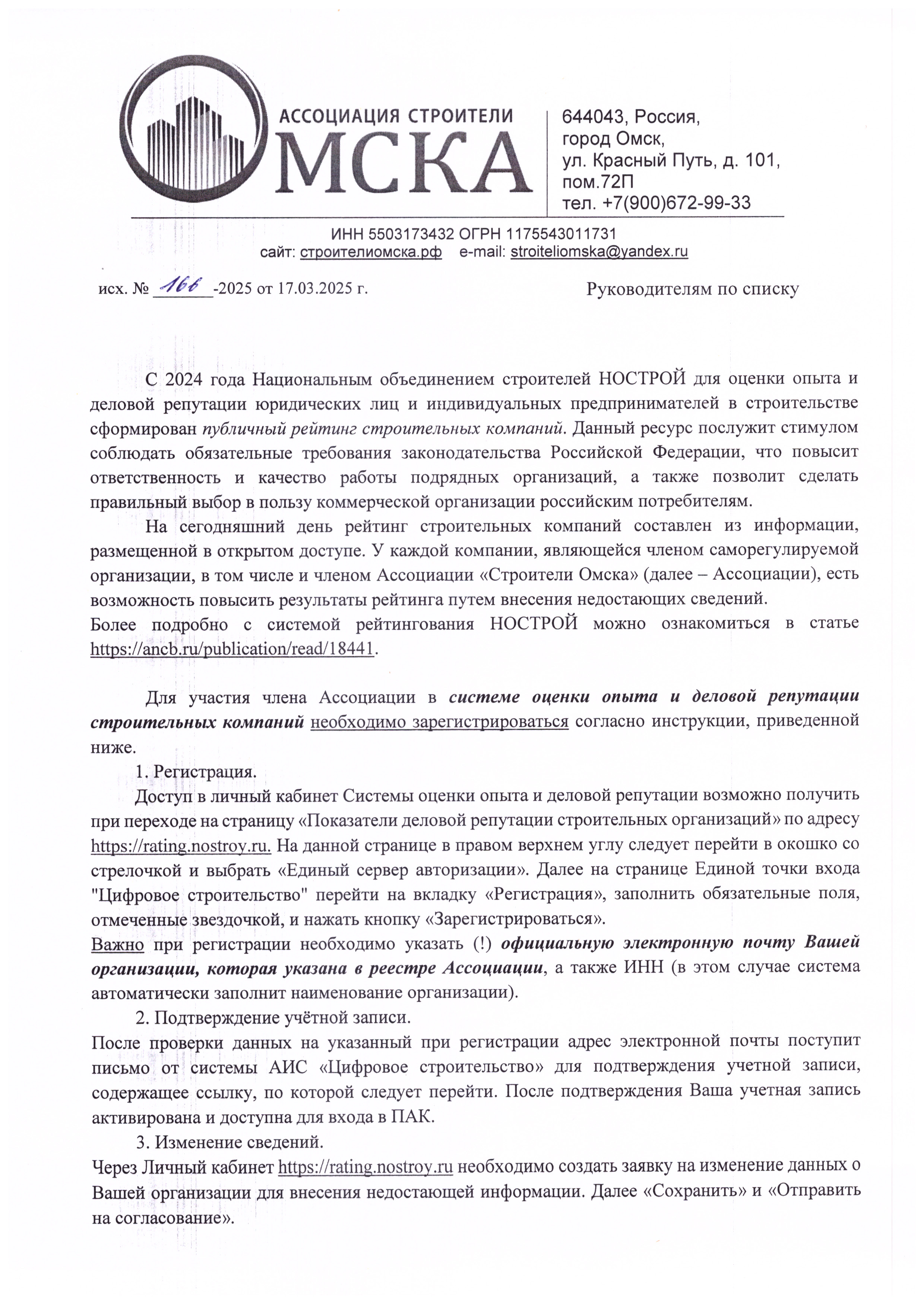 На сегодняшний день рейтинг строительных компаний составлен из информации, размещенной в открытом доступе. У каждой компании, являющейся членом саморегулируемой организации, в том числе и членом Ассоциации «Строители Омска» (далее – Ассоциации), есть возможность повысить результаты рейтинга путем внесения недостающих сведений.