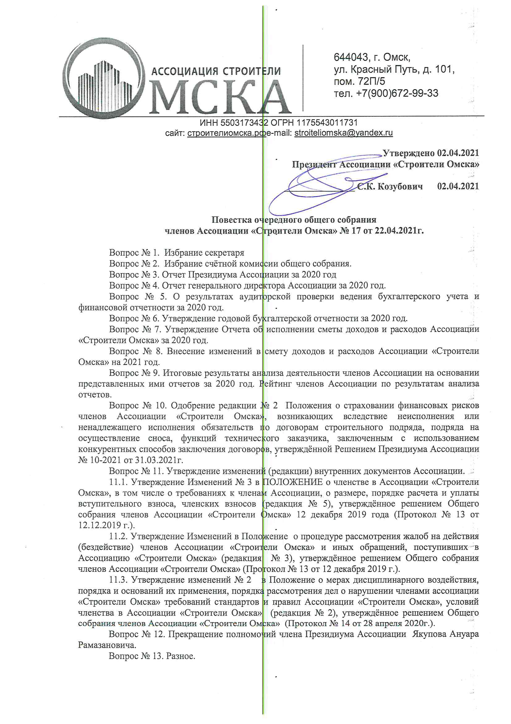 Вопрос № 8. Внесение изменений в смету доходов и расходов Ассоциации «Строители Омска» на 2021 год. (открыть)