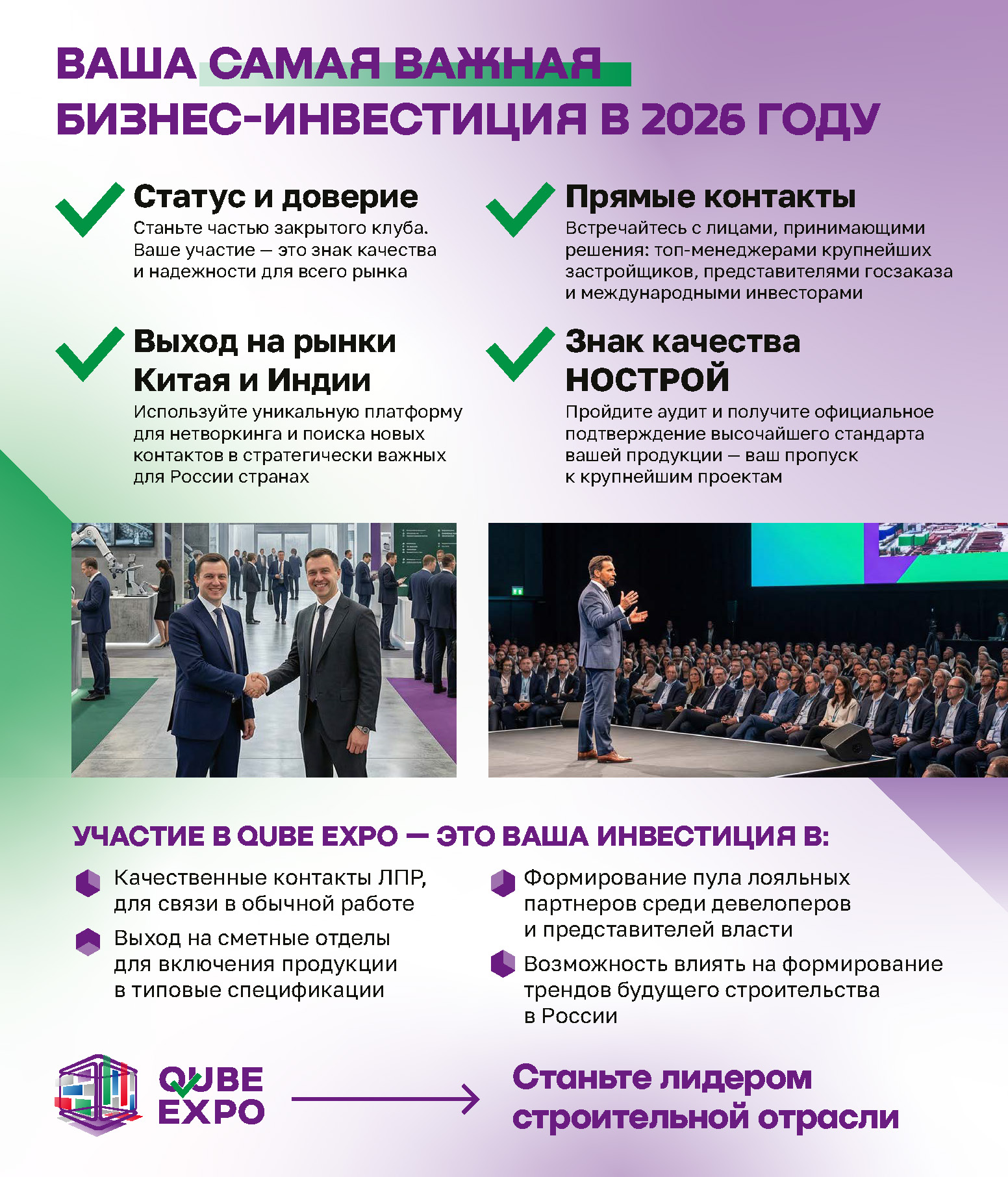 Ассоциация «Строители Омска» информирует членов Ассоциации о проведении в период с 1 по 3 декабря 2026 года Международной выставки строительных материалов и технологий QUBE Expo (в приложении презентация о Мероприятии и схематичный план выставочной экспозиции). Просим членов Ассоциации, производящих строительные материалы принять участие в выставке.